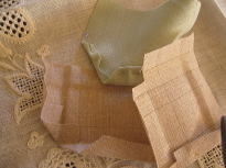 「はいは~い楽しそうね。」って訳で茶の麻布に白の糸で長いランナーを制作です。