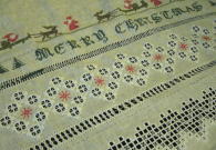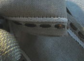 麻のリボンテープの両端の糸をそれぞれ2段に抜いて白糸でケーブルかがりを入れてみました。