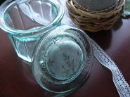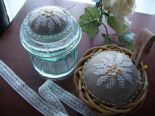 蓋付きビンは蓋の裏側に小さなピンクッションを取り付けビンの中には糸を入れてもよし糸くず入れにしてもよし。