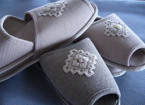 画像のスリッパいかがですか?素敵でしょう!無地のスリッパを買ってきてモチーフをのせ中央にはリボン刺繍を・・・