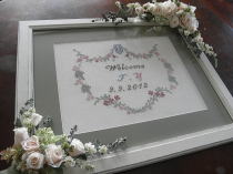 刺繍の色、フレームのデザイン、マットの柔らかいグリーンの色、そしてそれを囲むほんとに優しい色合いのプリザーブドのお花。それぞれが引き立てあい素晴らしい仕上がりになりました。