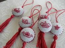 今年はシザーキーパーを・・・可愛らしい王冠シリーズのクロスステッチのパターンを利用して茶色の生地に赤の糸でまとめてみました。