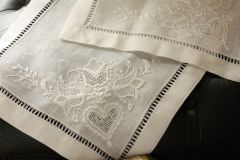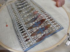 上級コースは難易度の高い幅広のドロンワークに挑戦しています。 糸を渡して結んでの繰り返しでしたが今回はその渡した糸を利用して間に表面積のある模様を 入れていきます。模様は2種類。くるくると巻き模様を16ケ作るタイプとお花模様を入れていくタイプ。 どちらも気持ちを平らにして同じ大きさに揃えていきます。 糸の色が塊になるため作品としてグッと引き立ってきます。 |