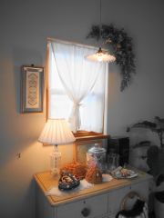 | 白いカーテンに白いチェストに照明類。ドライフラワーの色とフレームマットの色をリンクさせて 素敵なコーナーが出来上がりました。 こんな素敵なセンスが生活の中で小さなお姫様にも伝わるのでしょうね。 Sさんは次は「この窓と違う窓にカフェカーテンを・・・」と画像を送ってこられ白の麻に白糸で 刺し始められました。ご本人のイメージが出来上がっているところへのお手伝いも なかなか楽しいものです。 |
