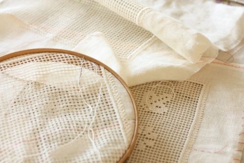 また現在もお教室の移動待ち時間にいつも持ち歩いているフィレレースの下かがり。