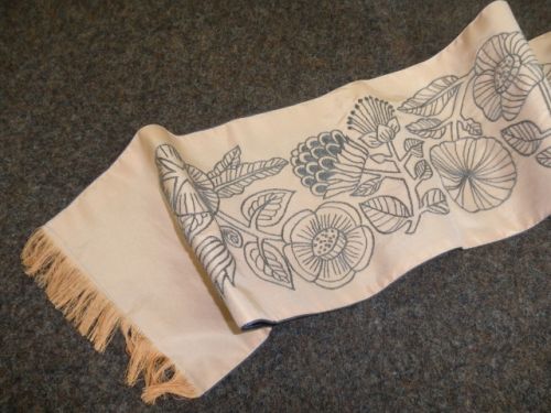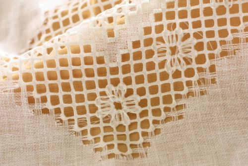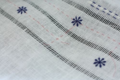 ドロンワークの様に 3本等間隔でラインが入った生地。中央のラインを真ん中にとってこんなお花を散らした