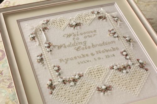 | 息子さんのご結婚に伴いウェディングパーティーのウェルカムボードのプレゼントです。 クロスステッチで小花を散らしリボン刺繍でバラのお花を・・・パールもたっぷりあしらって・・・ フレームも依頼がありましたのでピンクのマットを二重にした窓からちょっとのぞかせましたよ。 お日にち限定で頑張って作成下さいました。バッチリ間に合いましたね。おめでとうございます。 |