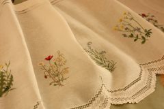 | 自宅教室にお通いのOさんは1度ハーダンガーでキッチンの窓辺にカフェカーテンを お作りになりましたが「もう1つイメージを変えてクロスステッチのお花を刺したいの。」と おっしゃり「フレメのお花をこんな風に6種類飛ばしたいのよ。」とご相談を受けました。 お花が大きくなりすぎずバランスよく納まるために13目の細かい生地を提案。 そして1つ1つハーダンガーでスカラップにして区切って6種類がちょうど窓辺のサイズに 合うように計算してこんな素敵なカフェカーテンが出来上がりましたよ。 |