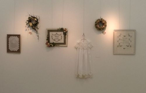 リングピロウ、そして洗礼用ベビードレスをコラボの壁面に・・・
