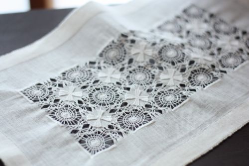 円形の手の込んだハーダンガーやシュバルムで飾られたテーブルランナー、ドロンワークのナフキンや |