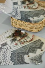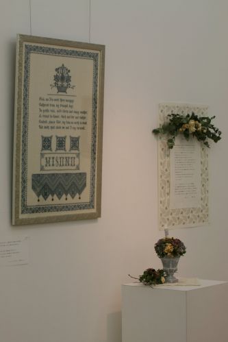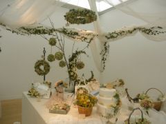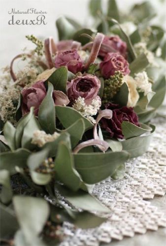 会場1F受付すぐ横にご案内の葉書に使用した作品をメインとして飾らせていただきました。 ごあいさつ文の上にはもちろんdeuxRの素敵なスワッグを・・・ |