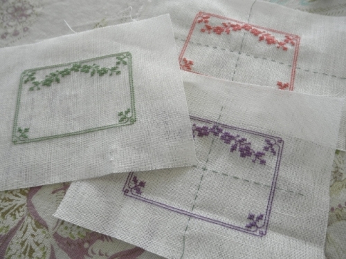 早い方は刺繍部分を刺し終えて提出なさっています。お教室ごとの色違いが花糸で可愛らしい!