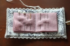 中布にフラノはミシンでたたいておきますので外の刺繍が出来たら中側に留めつけるだけ。