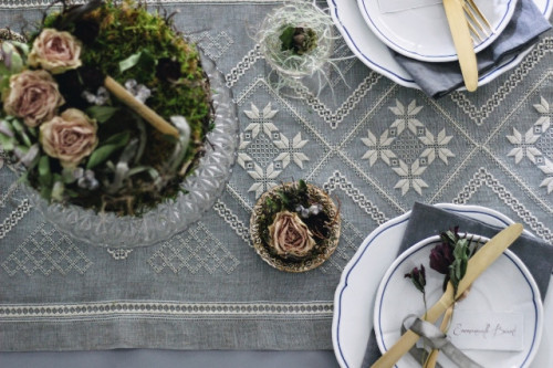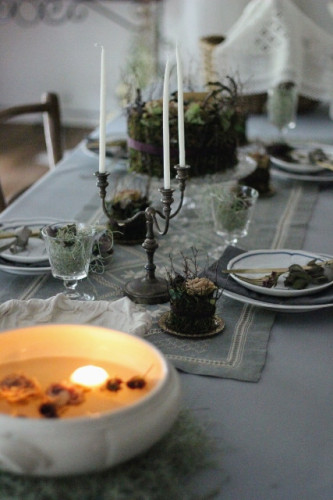 テーブルの上は中央に置くランナーを決めてからテーブルクロスの色を決め 紫のお花だわね・・・と言いながらイメージを膨らませてきました。 小物類は2人の私物。 手前のポットには渡部さん独特の蜜蝋をディップしたアベイユフルール。 蜜蝋でコーティングされてお水の上に浮いても平気なのです。 ケーキをホールと小さなものと・・・紫のテープリボンが大人の雰囲気に・・・