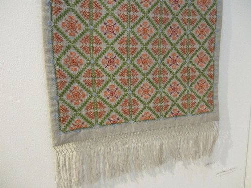 刺し色にちょっぴりブルーとワイン色を使って楽しい模様行きの作品です。