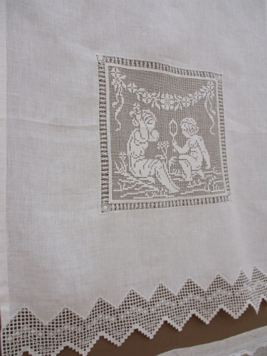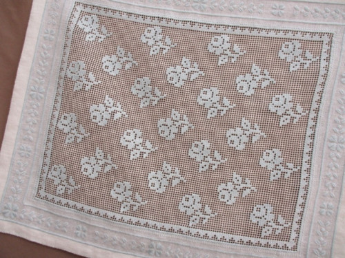 フィレレースの手法を使ったコーナーです。 フィレの作品の多くはすでにご紹介したトラバイユーズやバッグでの作品が多く 2F壁面に飾られたのはこんな作品。 柄を浮き立たせる為にネット状の部分は糸を等間隔で抜き下かがりを施してあります。
