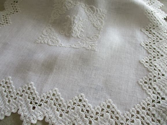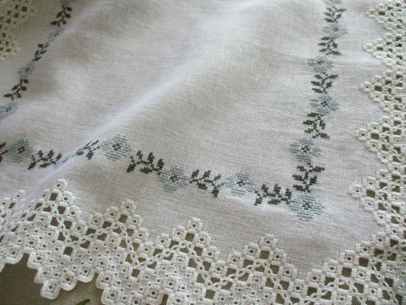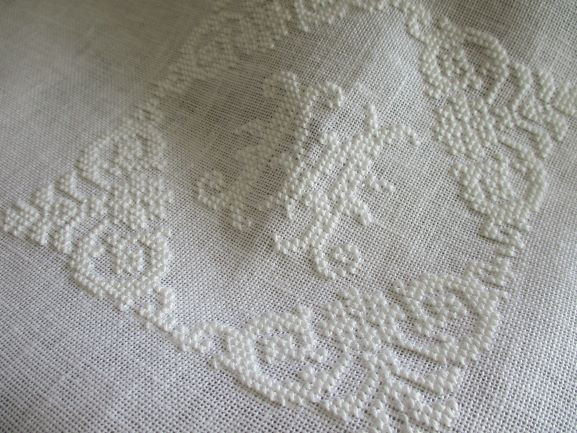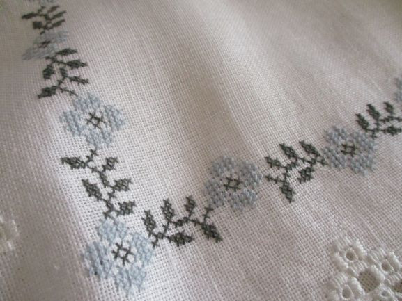 こちらはハーダンガー部分と同色の白糸#8でアルファベットを中心にクロスステッチで・・