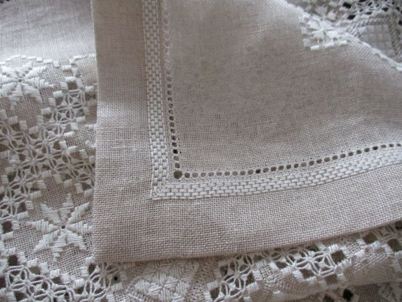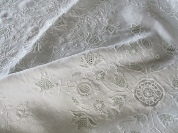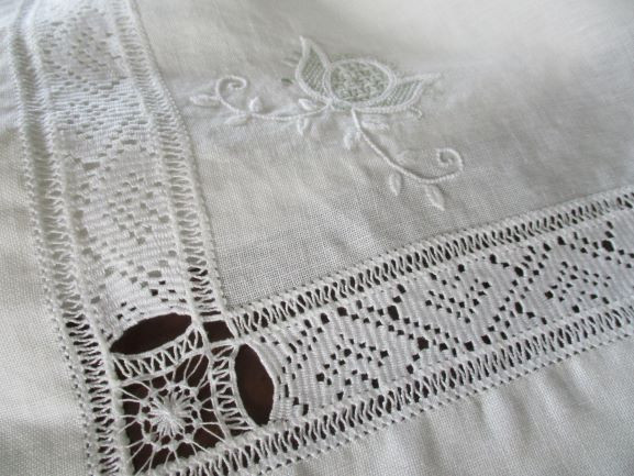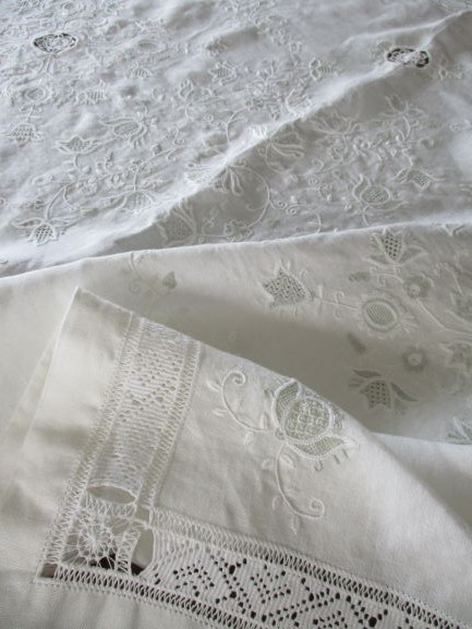 数カ所くるりと生地を抜いたカットワーク, それに負けない幅広の外周ドロンワークのダーニング、