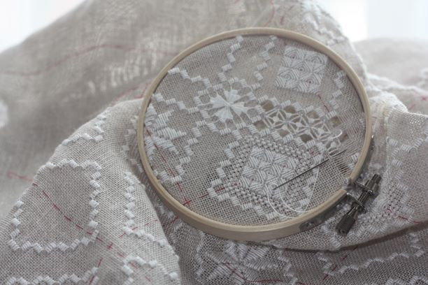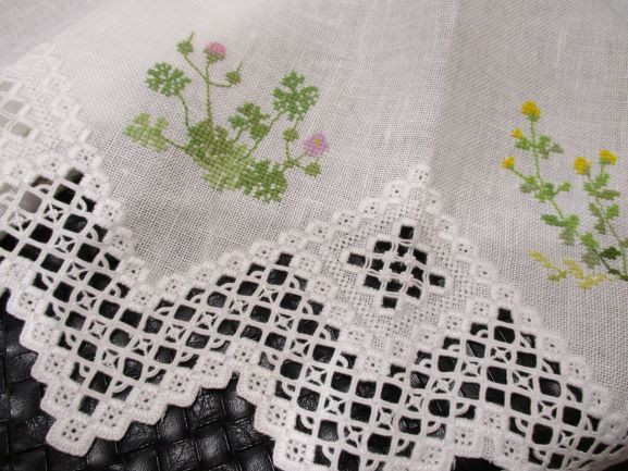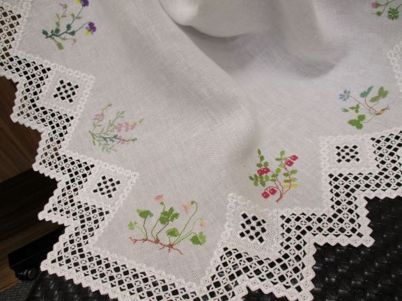 テーブルクロスに配された優しい花糸のクロスステッチとハーダンガーの組み合わせ。 Iさんは後で洗った時に花糸の色落ちが嫌でまず糸にお水を通して色止めを施したとのこと。