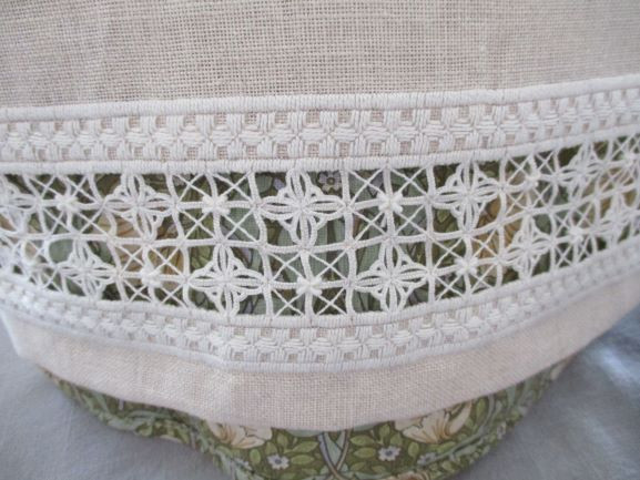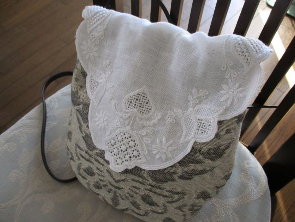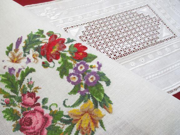 b こちらはキルトの柄のバラに合わせてクロスステッチとドロンワークで仕上げました。