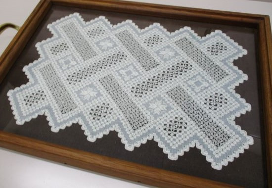 プントアンティーコの白のドイリーとイギリスのクロスステッチの楕円リース。