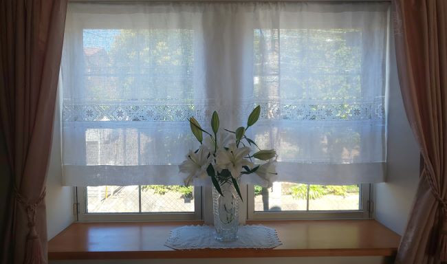 昔お刺しになったドイリーも花瓶の下に敷かれセットで窓辺を飾っています。 |