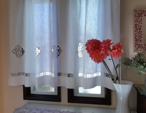 等間隔で同じ模様を繰り返し、裾の三つ折り上には大きく開いたドロンワーク。