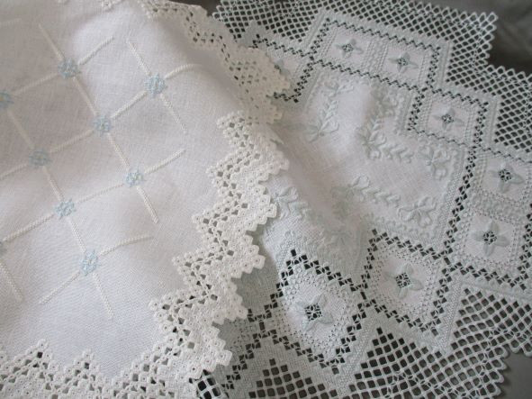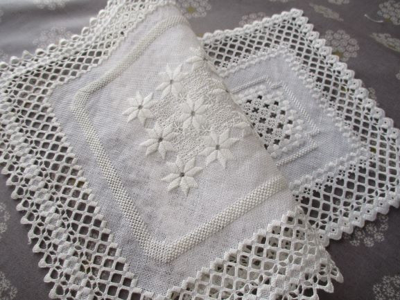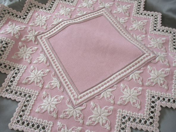 中央のライン内にはクロスステッチ。ピンクを2種選び品よく小花が並びます。