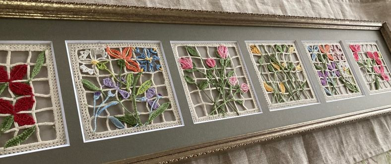 カラフルな糸を使って刺したお花の同サイズのレティを仕上げていらっしゃいました。