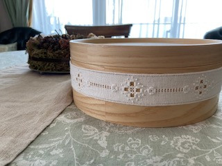 お裁縫箱にしようと思っている丸いBOXの側面に麻のテープに刺繍をして