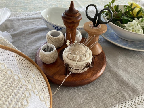 #8と#12の使用糸を乗せ昔作ったピンクッションがちょうど間に挟まったのでそれを乗せ