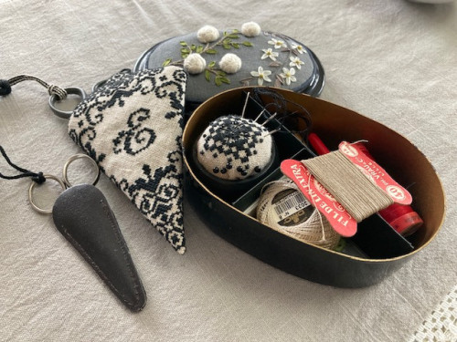 見て見て、彼女のお針箱のグッズの中に統一感を持って収まりました。